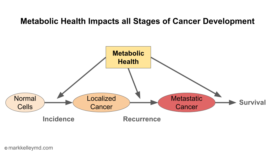 The goal of this portion of my website is to help you understand metabolism, metabolic health and their relationship to cancer. We will review the evidence that metabolic health impacts all stages of cancer development and progression, as summarized in figure 1. I am seeking to provide you with the knowledge and tools to make lifestyle changes that improve your metabolic health and reduce the risk of cancer. This can include reducing the risk of cancer developing or coming back. The great news is that the metabolic changes that reduce cancer risk also improve general health and wellbeing, functional status, quality of life, longevity and health span.